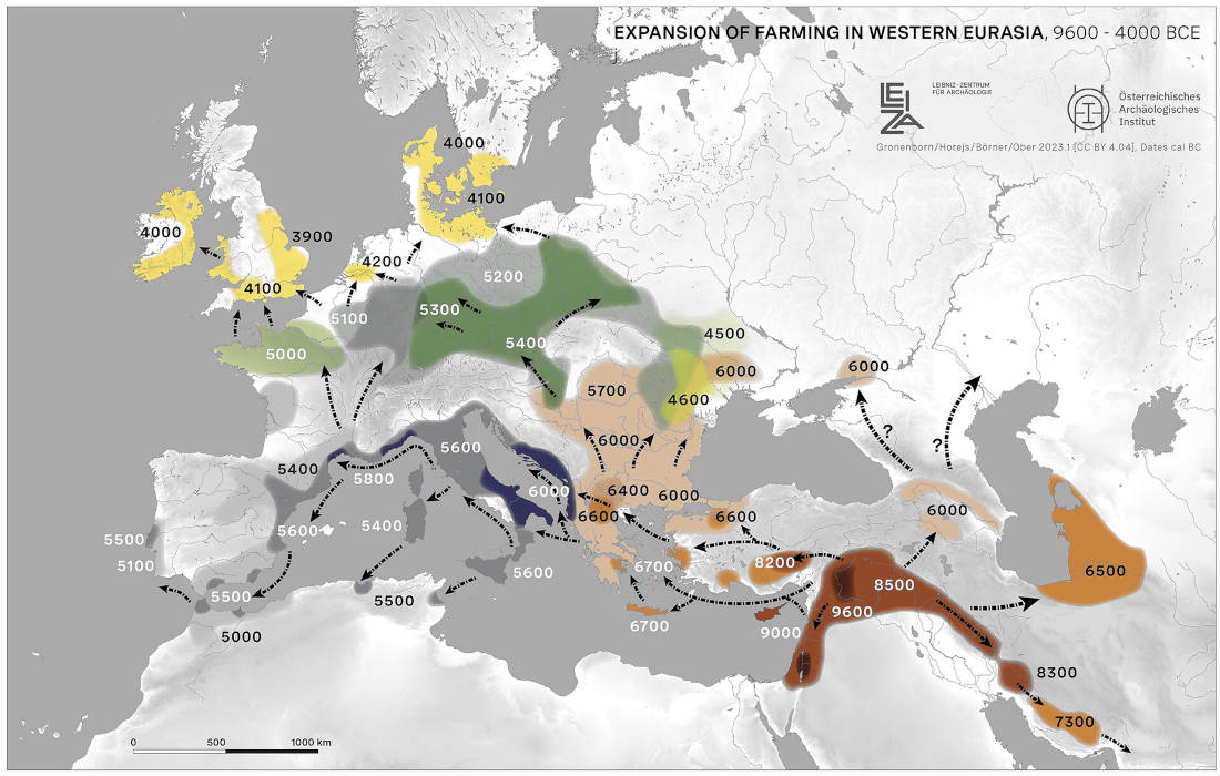 Von diesem Ursprungsgebiet aus breiteten sich diese sogenannten anatolischen Bauern seit etwa 9000 v. Chr. mit ihrer bäuerlichen Lebensweise über Land und Mittelmeer nach Europa aus.