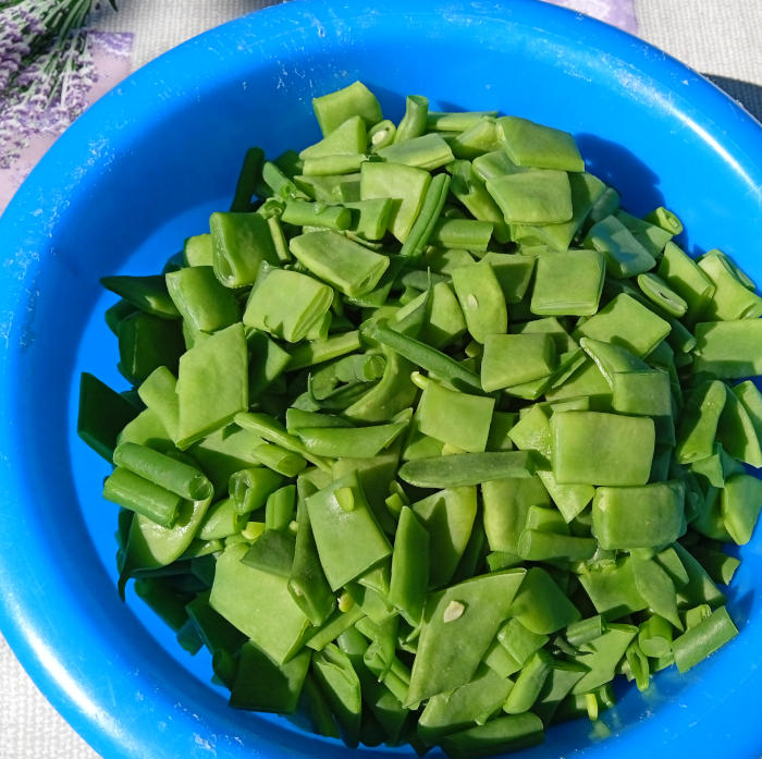 - Bohnen vorbereiten: Enden abschneiden, eventuell fädeln, in etwa 3–5 cm lange Stücke schneiden.
