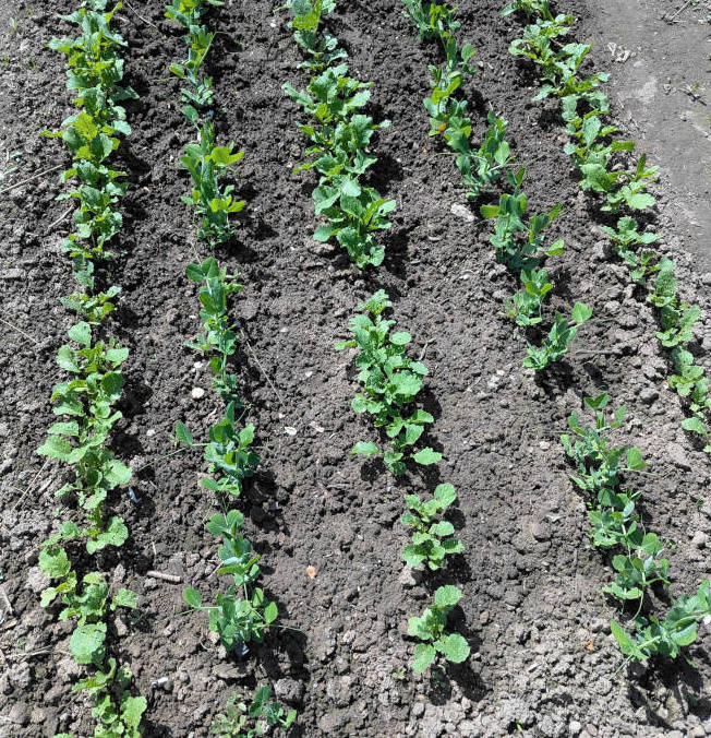 - Für die Erbsen legen wir eine Doppelreihe mit einem Abstand von 40 bis 45 Zentimetern an.