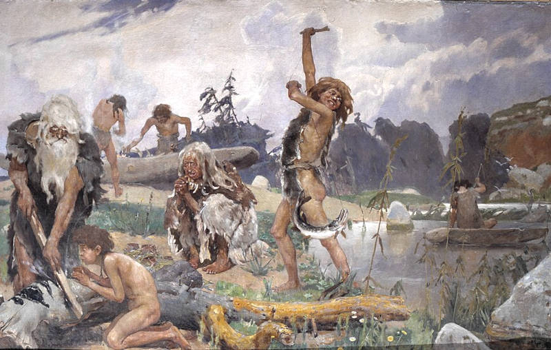 - Steinzeit-Fischer: Stone age by Vasnetsov 02.jpg (Wikimedia); das komplette Gemälde „Die Steinzeit“ (1884) im Online-Katalog des Staatlichen Historischen Museums in Moskau (SHM – Gosudarstvennyj Istoričeskij Muzej)
