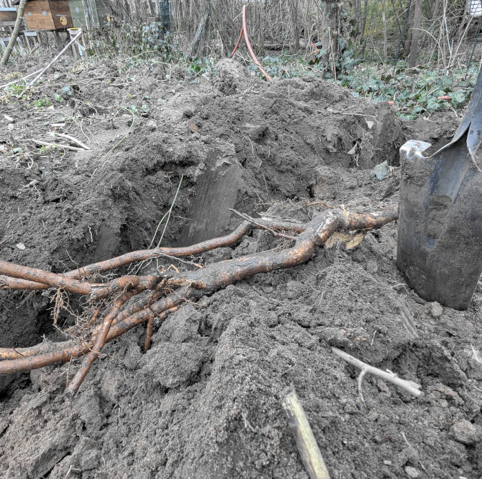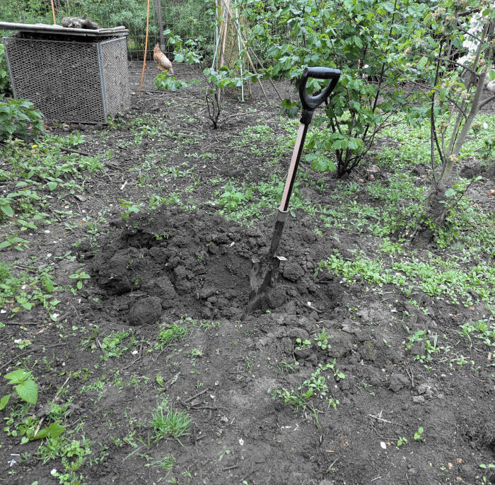 An der Stelle, an der der halb verrottete Kompost neu aufgeschichtet werden soll, lockere ich zunächst den Boden etwa 50 Zentimeter tief. Das entspricht der Vorgehensweise, die ich auch bei der sogenannten Tiefbeetkultur anwende. Der Untergrund wird also gründlich gelockert, sodass Wasser, Luft und Wurzeln leichter eindringen können.