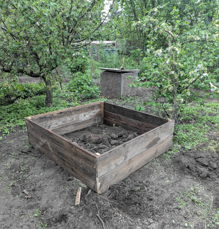 Darauf setze ich – wenn vom Platz her nötig – einen Holzrahmen von etwa einem halben Meter Höhe. Dieser wird anschließend mit halb verrottetem Kompost gefüllt.