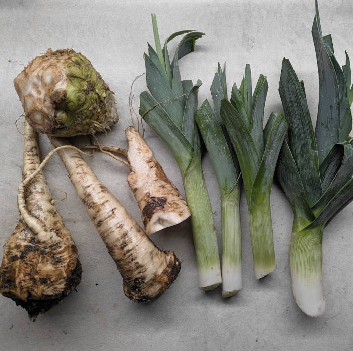 Als Zweites – und dafür geht ebenfalls ein beträchtlicher Anteil unseres Lauchs drauf – dient Porree als klassisches Suppengrün. Er ist fester Bestandteil unserer Fleischbrühen aus Rindfleisch, Rinderknochen und Suppenhuhn.
