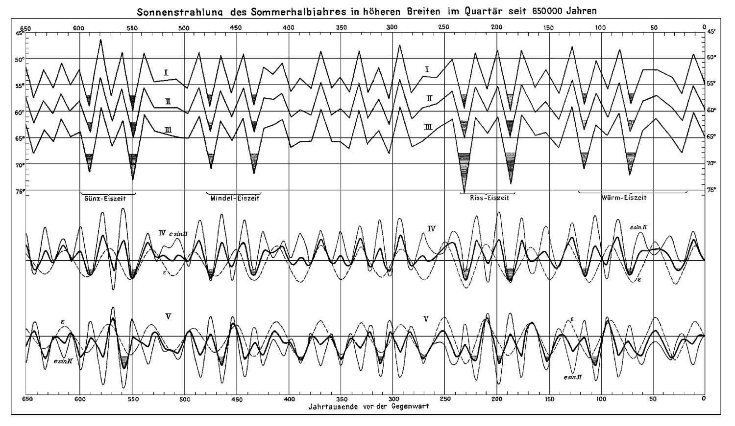 Diese Grafik, die auf den Berechnungen von Milutin Milanković basiert , zeigt, wie astronomische Zyklen die Eiszeiten (Kaltzeiten) und Warmzeiten unseres Planeten steuern. Die Hauptaussage: Das Klima ändert sich, weil die Verteilung der Sonnenenergie auf der Erde – und nicht die Gesamtmenge – schwankt. Entscheidend ist die Sonneneinstrahlung im Sommer in den nördlichen Regionen. Grafik und These satmmen aus dem Jahr 1924 [siehe 7b].