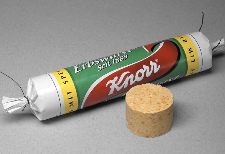 [3] Erbswurst ist kein echtes Wurstprodukt, sondern eines der ältesten industriell hergestellten Fertiggerichte: Portionstabletten („Pucks“) aus Erbsenmehl, Fett (ursprünglich Rinderfett/Speck, später Palmöl), Salz, Gewürzen und Aromen, die in einer wurstförmigen, aluminiumbeschichteten Papierrolle verpackt wurden. Man zerdrückte sie, löste sie in kaltem Wasser auf und kochte kurz – fertig war eine sämige Erbsensuppe. Erfunden 1867 von Johann Heinrich Grüneberg in Berlin, verkauft an die preußische Armee und ab 1870 als „eiserne Ration“ im Deutsch-Französischen Krieg massenhaft produziert. Ab 1889 von Knorr vermarktet (Palffy kannte sie schon 1884!); Produktion erst 2018 eingestellt (!); Renaissance bei Prepper- und Outdoor-Fans, die versuchen das Produkt kopieren. Ein Klassiker der Militär- und Notverpflegung – haltbar, nahrhaft und transportabel.