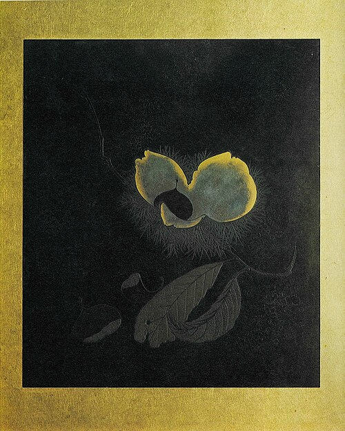 2) Lackmalerei von Shibata Zeshin „Kastanien von Shibata Zeshin, brauner und schwarzer Lack auf Goldpapier in einem kleinen Tischleinwand, 1870er Jahre (Honolulu Museum of Art); Quelle in den Webarchiven