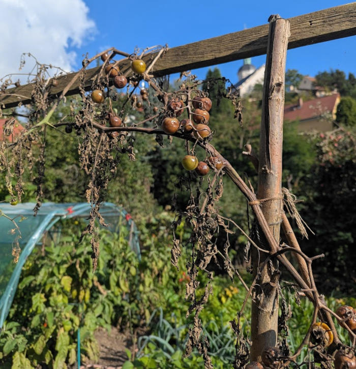 Die oberen, frischen Blätter betrieben also weiterhin aktive Photosynthese und versorgten den gesamten Pflanzenstock mit Nährstoffen. So konnten wir bis zum ersten Frost reife Tomaten ernten, während andere Sorten längst erschöpft waren.