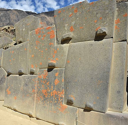 Bild: Steintor (Inka-Pintay) in Ollantaytambo, Peru. Die Blöcke bestehen aus hartem Rosa Andesit. Auffällig sind die Noppen: Sie sind nicht einfach angesetzt, sondern aus dem vollen Stein herausgearbeitet.